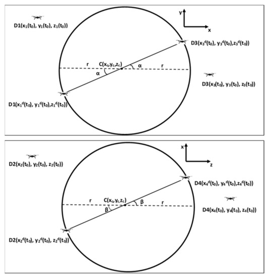 where is the center of the formation, is the radius of the circles, and are the initial rotation angles, given as in Figure 1, defined by the user, and is the initial time. D1 and D3 UAVs form a group in the x-y plane, while D2 and D4 UAVs form another group in the x-z plane.