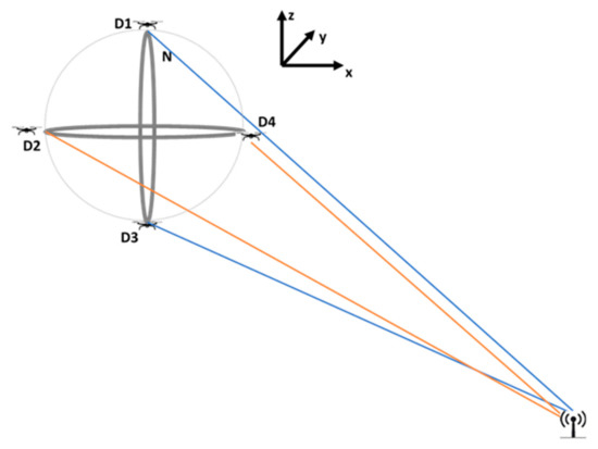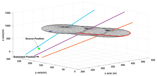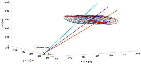 As mentioned above, the line intersects the augmented point, and the formation center will also intersect the source position as given in Figure 5. Movements of UAVs on the sphere and the angles are also demonstrated in Figure 5. One line is not enough to find the source’s location. By moving the UAV group and keeping the formation, multiple lines are generated, as demonstrated in Figure 6. The intersection of these lines gives the source’s location.