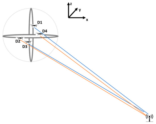Consider the scenario shown in Figure 2, they detect a target while flying. The received signal power in each group is compared by itself, and UAVs move in their planes until they receive equal signal power. In this scenario, D4 gets more power than D2, so D4 moves away from the target and D2 moves towards the target. Same as for D1 and D3, D1 receives less power than D3, therefore D1 approaches to the target while D3 moves away from the target, as given in Figure 3.