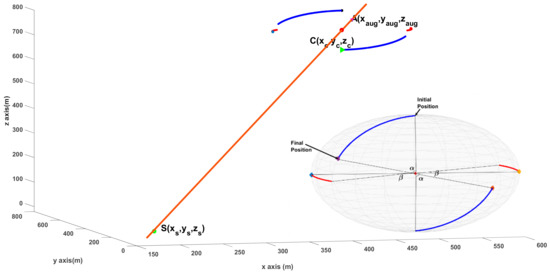 An augmented point, , is defined on the sphere, which has equal distance to each UAV and satisfies the criteria below: