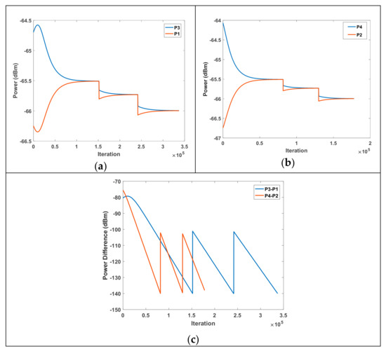 (a) Received power by D1 and D3, (b) received power by D2 and D4, and (c) power differences of each group.