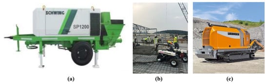 - LIEBHERR. 140 D-K Stage 1 Crawler Concrete Pump. 2020. Available online: https://www.liebherr.com/en/sgp/products/construction-machines/concrete-technology/concrete-pumps/stationary-concrete-pumps/details/85726.html (accessed on 16 November 2022).