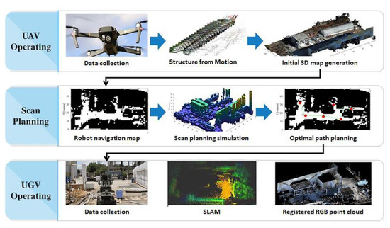 - Kim, P.; Park, J.; Cho, Y.K.; Kang, J. UAV-Assisted Autonomous Mobile Robot Navigation for as-Is 3D Data Collection and Registration in Cluttered Environments. Autom. Constr. 2019, 106, 102918. [Google Scholar] [CrossRef]