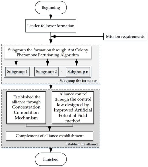 Among the key technologies of Multi-Unmanned Aerial Vehicle (UAV) leader–follower formation control, formation reconfiguration technology is an important element to ensure that multiple UAVs can successfully complete their missions in a complex operating environment. This paper investigates the problem of formation reconfiguration due to battlefield mission requirements. Firstly, in response to the mission requirements, the article proposes the Ant Colony Pheromone Partitioning Algorithm to subgroup the formation. Secondly, the paper establishes the alliance for the obtained subgroups. For the problem of no leader within the alliance formed after grouping or reconfiguring, the Information Concentration Competition Mechanism is introduced to flexibly select information leaders. For the problem of the stability of alliance structure problem, the control law of the Improved Artificial Potential Field method is designed, which can effectively form a stable formation to avoid collision of UAVs in the alliance. Thirdly, the Lyapunov approach is employed for convergence analysis. Finally, the simulation results of multi-UAV formation control show that the partitioning algorithm and the competition mechanism proposed can form a stable alliance as well as deal with the no-leader in it, and the improved artificial potential field designed can effectively avoid collision of the alliance and also prove the highly efficient performance of the algorithm in this paper.