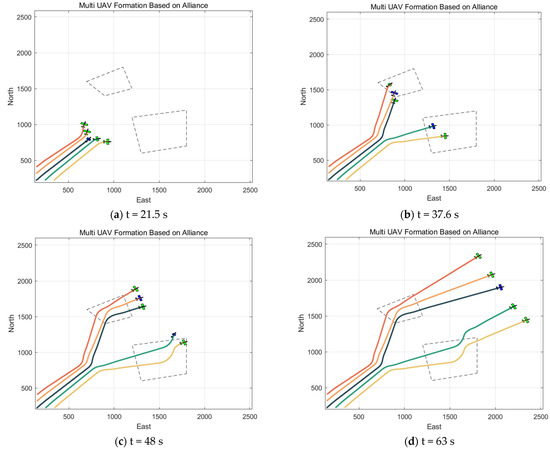 It can be seen from Figure 5a that the V-shaped UAV formation carried out the subgrouping behavior, according to the demand of the mission places, to form two alliances and fly to the mission locations to execute the mission, respectively; Figure 5b shows the two alliances executing the mission at the task zone, respectively; in the above alliance, the middle UAV is the leader, and in the below alliance, the upper drone is the leader; Figure 5c shows that the alliances’ detachment leaves the task zone and group again to form a unified formation; Figure 5d shows that all drones carried out grouping behavior to form a zigzag formation.