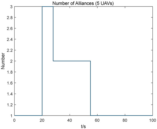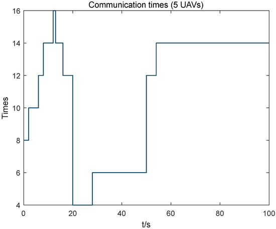 The change in the number of alliances per moment in the formation and the total number of communications between UAVs are shown in Figure 6 and Figure 7. During the simulation, the UAV receives a message from a friendly aircraft in the domain once per moment as one communication. It can be seen that when the alliance tends to be stable, the number of inter-UAV communications also tends to be stable.