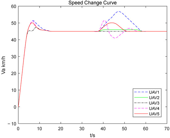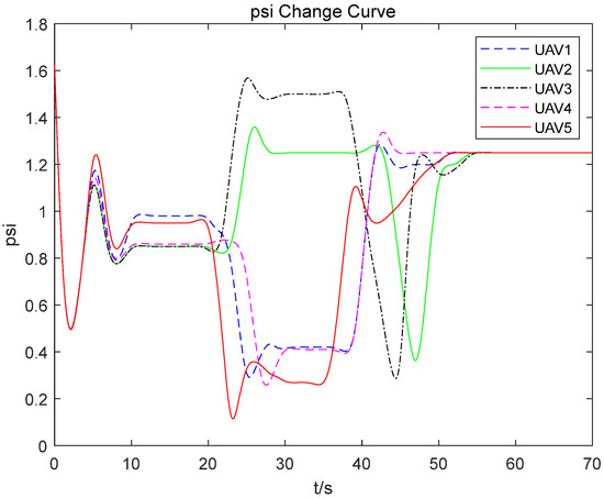 Figure 8 and Figure 9 show the speed and yaw angle change curves of the five UAVs. It can be seen from Figure 7 that the UAVs can adjust their speed within the controllable range according to the mission situation so that the formation speed eventually converges, and all UAVs will fly stably at 45 km/h; Figure 8 shows that the UAVs are able to maintain a consistent yaw angle after forming a stable formation.
