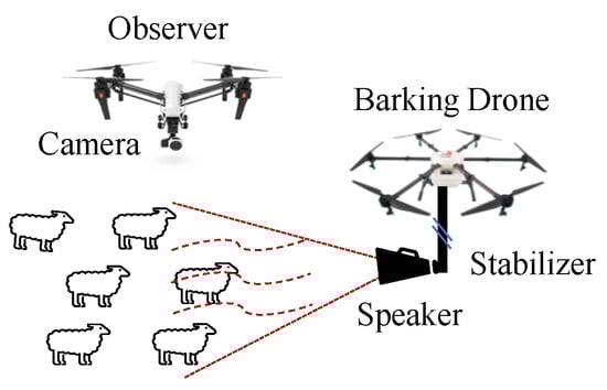 28]. Drones can act like sheepdogs by playing a pre-recorded dog bark loudly through a speaker, referred to as the barking drone. Recently, some successful attempts have been made using human-piloted barking drones to herd flocks of farm animals [