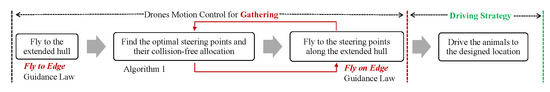Section 4.3 presents the optimal positions (steering points) for the barking drones to efficiently gather animals, as well the collision-free allocation of the steering points. A flowchart of the proposed method is shown in