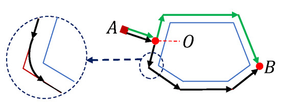 B in the shortest time following a given direction, e.g., clockwise or counterclockwise, while keeping the barking drone on the extended hull. Since the drone has non-holonomic motion dynamics, it is allowed to move along a short arc when traveling between two adjacent edges, see