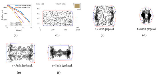 Figure 10a reveals that the difference between the time of gathering 200 animals and 1000 animals is not that obvious, with both the proposed method and the benchmark method. The proposed method, however, can always use less time to complete the gathering mission. This is because that the proposed method always chases and repulses the animals that are farthest to the centre, while the benchmark method is repulsing the animals indiscriminately. Therefore, the animals’ footprint with the proposed method becomes increasingly round-like during shrinking, while animals’ footprint with the benchmark method becomes long and narrow. This fact can be observed by comparing