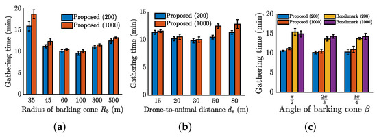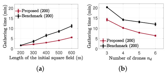 Figure 11a shows that the difference between the gathering time of the benchmark method and the proposed method increases with the initial square field length. It means the benchmark method is more ‘sensitive’ to the varying length of the initial square field. We further investigate the relationship between the gathering time and the the number of barking drones