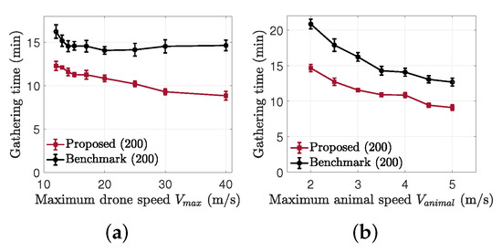 Next, we investigate the impact of the drone speed and animal speed on the gathering time; see