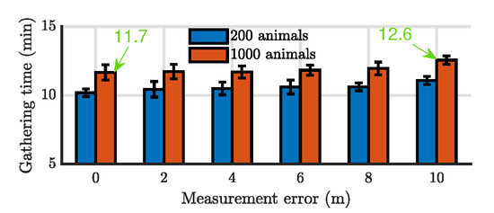 Figure 12 shows that the average gathering time increased slightly with the measurement error increases from 2 to 10 m for both cases. For example, from no measurement error to 10 m error, the average gathering time for 1000 animals increased from 11.7 min to 12.6 min. The difference is less than 1 min. Moreover, the impact of measurement errors on the average gathering time is less significant in the case of 200 animals (see