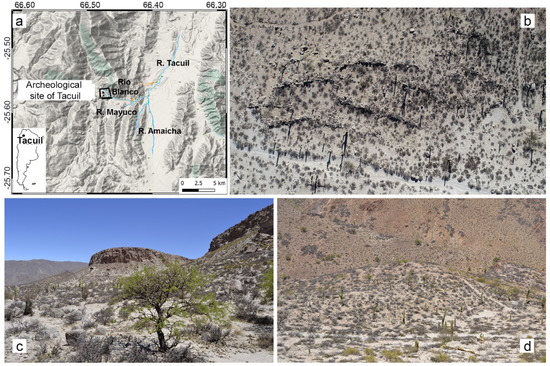 (a) Location map of the study area, the rectangle encloses the extent investigated by UAV-based and terrestrial photogrammetry; (b) top view of a hamlet of Tacuil, long shadows point out some remains and the presence of only sparse and low vegetation; (c,d) panoramic views of the site, the two hilltops, the topography, and the surrounding vegetation.