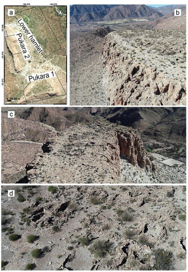 The archaeological complex, known since the colonial era and recently studied by Veronica Williams and her team [21,27,28], consists of three main areas built and used roughly in the same period (XIII–XIV c.). Such areas are reported on Figure 2a by the names Pukara 1 (2820 m), Pukara 2 (2838 m), and Lower Hamlet (2740 m). In the present day, Pukara 2 is unreachable without mountain-climbing equipment for safety (see Figure 2b,c). Figure 2d shows the archaeological structures discovered by the UAV survey on Pukara 1, where ground surveys were not feasible.