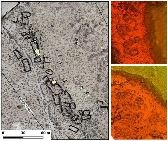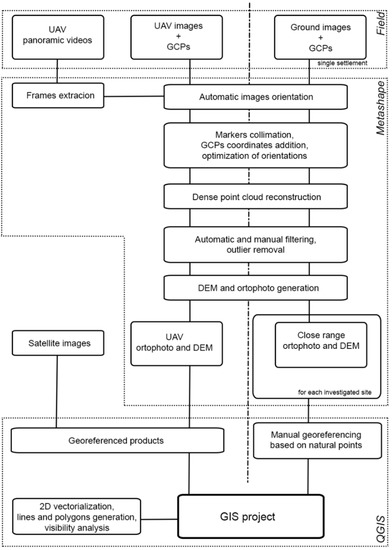 Generated DEM and orthophotos were imported in QGIS (www.qgis.org, accessed on 29 December 2021) to create maps of the area and enable spatial analysis of the detected settlements. UAV products were georeferenced according to the reference system used for GCPs surveys. Products based on the ground survey required preliminary processing: some of the generated orthophotos were within the same reference system (local, according to the total station survey), while others were registered thanks to common points. As a last step, the final orthophotos were georeferenced using natural points in common with UAV products.