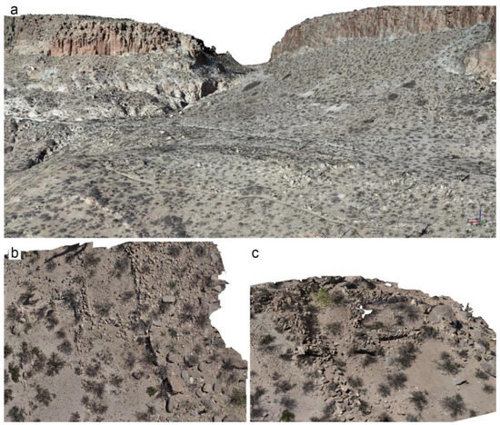 Sectors of the investigated areas as represented in the virtual model: (a) view of the textured 3D model obtained for the Tacuil area; (b,c) views of two structures in the lower hamlet documented through a ground photogrammetry approach.