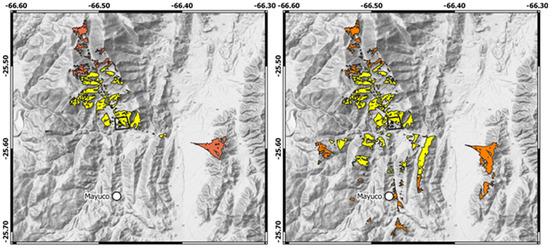 The visibility analysis was carried out on both the large and local scales. For the purpose of the large-scale visibility study, a digital elevation model, based on globally available visible satellite data, was used. In particular, the 30 m resolution ASTER Global Digital Elevation Model (ASTGTM v002,) was selected. Besides, to perform the visibility analyses at the best achievable level of detail within the area of Tacuil, the elevation model from the UAV photogrammetry survey was processed at 5 cm spatial resolution. Figure 7 summarizes the results of these analyses. In particular, the left and right figures report the analyses carried out over large extents by setting distances of 8 and 15 km, respectively, with respect to an ideal observer placed in the center of the two pukaras. The algorithm considers the effect of the Earth’s curvature and the atmospheric refraction to achieve reliable results over considerable distances.