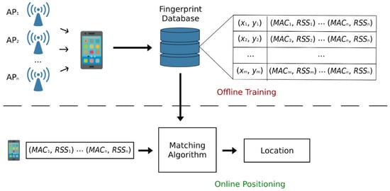 Wi-Fi fingerprinting methodology. Access points are received by a user, and the corresponding identifier and location is saved to the database. When another device receives a set of identifier and the corresponding power, it is sent to a server to be converted to a location solution.