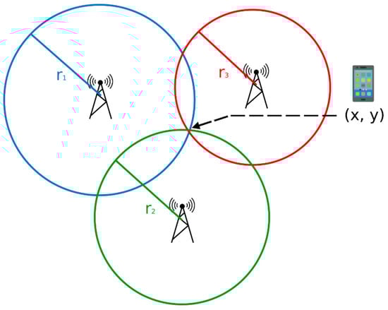 Illustration of cell localization using cell towers. If the locations of the cell towers are known, and the distance to each cell tower can be estimated, a position solution can be computed.