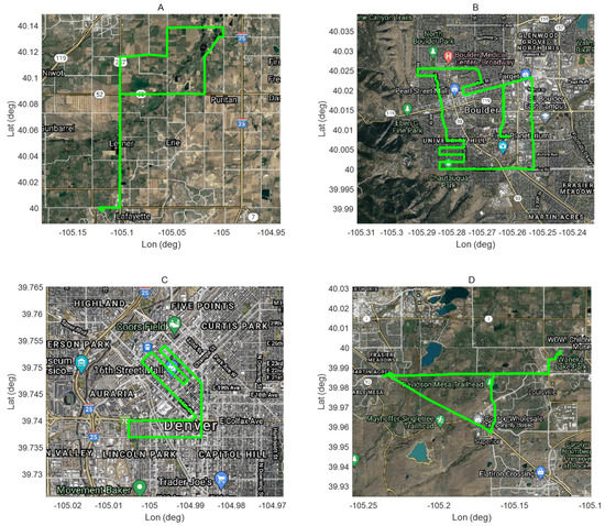 The routes used for each of the test scenarios. (A) Erie, Colorado, with limited Wi-Fi and Cell coverage; (B) downtown Boulder, Colorado, with many residential network coverage; (C) downtown Denver, Colorado, with many corporate and business network coverage; (D) a loop with a lot of elevation changes;.