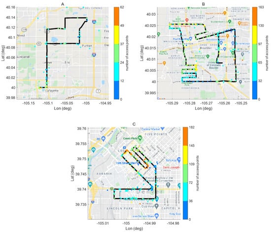 Representation of the route in black, available NLP in colored dots, and the representation of the number of access points in the respective colors. (A) is the rural scenario, (B) is the suburban drive, and (C) is the urban test for downtown Denver.