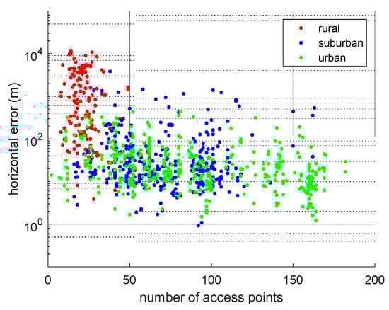 Relationship between the number of access points and the observed horizontal error. When only cell positioning is used (rural), the horizontal error was the greatest. For suburban and urban scenarios when Wi-Fi positioning was used, an increased number of access points meant smaller horizontal error, but the advantage plateaus when enough access points are available.