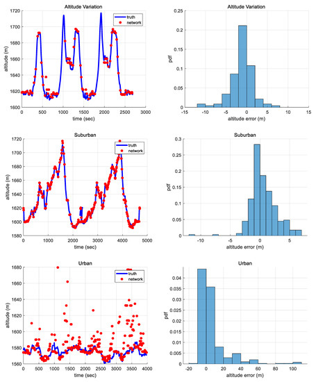 Observed accuracy of the altitude measurements from the scenarios: altitude variation, suburban, and urban.