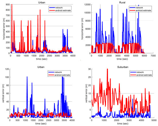 The Android network location engine not only provides the NLP, but also the expected accuracy of the NLP. This expected accuracy is defined by Google to be the radius of 68% confidence. [35] For horizontal Wi-Fi positioning, the minimum threshold was 11 m, and the maximum was 156.9 m. For horizontal cell positioning, the minimum was 500 m and the maximum was 2300 m. For vertical Wi-Fi positioning, the threshold was between 1 m and 30 m. In order to assess how accurate these values are, the accuracy of the NLP was compared with the estimate for various environments, and the results are shown in the time domain in Figure 9. In the case of horizontal errors, for the urban environment, the Android estimate was fairly accurate and bounded 75% of the errors. In the case of the suburban scenario, it was successful in bounding 72% of the errors. However, in the case of the rural scenario, it was only able to bound 38% of the errors. This indicates that although the Android NLP estimates successfully bound 68% of the measurements for urban and suburban scenarios, they need to be inflated significantly more for the rural environment where only cell positioning is available. In the case of altitude errors, the android estimates bounded 64.2% for the urban scenario, and 93.1% of the errors for the suburban scenario. The rural scenario was not considered due to the limited number of available Wi-Fi altitude measurements. This indicates that although the network altitude is well bounded for smaller buildings, the estimate needs to be inflated for urban environments with Wi-Fi access points located on multiple floors.