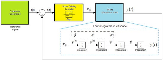 First of all, we consider the dynamics in Roll axis given by y-dynamic in (16). We will implement a nonlinear controller design based on super twisting technique in order to guarantee better convergence accuracy of , , y and states. Then, if we differentiate twice, (16) leads to