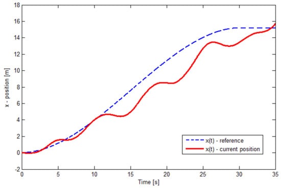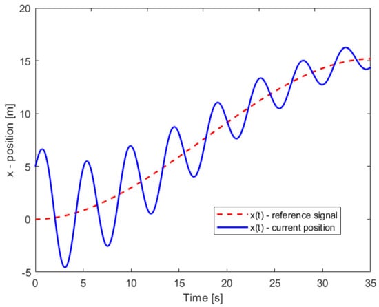 PD-trajectory tracking control response on the x-axis. Trajectory-tracking on this axis oscillates around the desired reference signal.