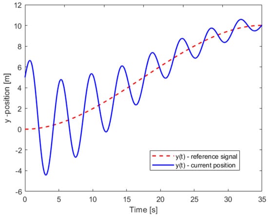 PD-trajectory tracking control response on the y-axis. Trajectory-tracking on this axis oscillates around the desired reference signal.