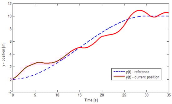 To start, we can observe in Figure 3 and Figure 4 the trajectory-tracking control using a PD-controller for the axes x and y, respectively. In these figures, it can be seen that the current position of the Quadrotor helicopter described by Equation (52) oscillates around the given reference, which indicates a poor performance because it never manages to converge to the stipulated reference. This happens in both cases for the x and y axes. Moreover, in Figure 4, a small improvement in the performance of the controller can be noted, but it is not sufficient to bring the helicopter to the proposed trajectory efficiently. However, the second order sliding mode approach has the Quadrotor helicopter follow the proposed path effectiveness on the x-axis, as can be seen in the Figure 5. Notice that the actual position (trajectory) converges faster to the desired reference signal even under external perturbations. In the same way, in Figure 6, this response, which describes the behavior in the y-axis at the moment is described. We can conclude based on these two last Figures that the proposed nonlinear controller renders the Quadrotor helicopter following the designated trajectory under external disturbances using the super-twisting control satisfactorily. In addition, the super-twisting algorithm implemented through mathematical models was converted to their respective Simulink models for ease of simulations.