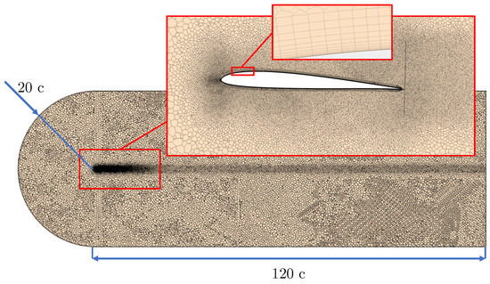 All the case studies follow the same computational setup shown in [24,25]. In both cases, 2.5D simulations of a wing section were performed, and the size of the domain was proven to be big enough so the position of the far field boundary conditions did not affect the final solution. The upstream boundary condition is located 20 chords from the wing and uses a free-stream speed condition. Downstream of the wing, a pressure outlet boundary condition is set. The lateral boundaries are set as symmetry boundary conditions. Finally, the surface of the wing is modelled as a non-slip, smooth wall. A sketch of the computational grid is shown in Figure 2.