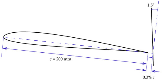 In all the simulations, the propeller is located over the trailing edge of the wing section, but different positions are studied. The propeller is, in any case, modelled with a single virtual disc actuator, using the Blade Element Momentum Theory (BEMT). This 80 of diameter propeller is separated from the trailing edge around 1 in the direction of the chord. The relative angle between the profile and the normal to the propeller, the draft angle, is set at 1.5°. These dimensions are shown in Figure 3, and have been chosen based on previous studies [24,25].