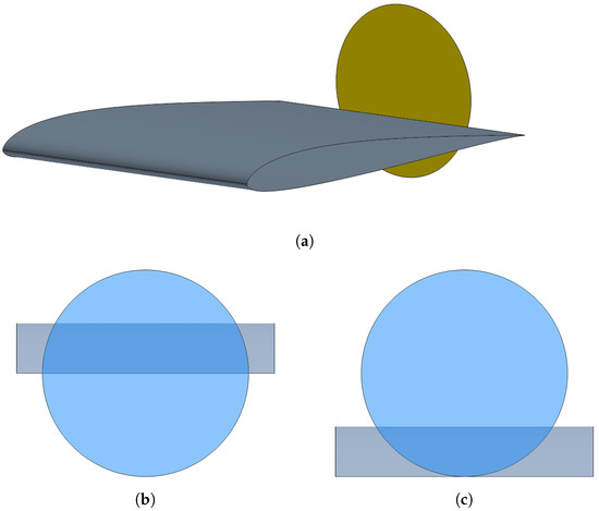 Maximum and minimum propeller heights above the trailing edge. (a) Section of wing simulated with a virtual disc for modelling the propeller. (b) 0% position. (c) 100% position.