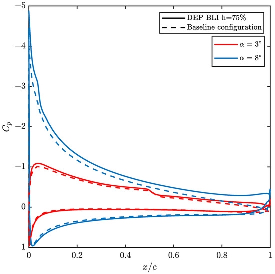 Figure 6 exemplifies in solid lines for a propeller height position of 75% the change in the of the suction side (mostly negative values of ) and pressure side (mostly positive values of ) due to the increase in the angle of attack, along the normalised chord of the airfoil. As a reference, and in dashed lines, the results for a case without BLI is also shown.