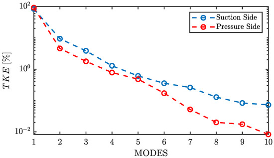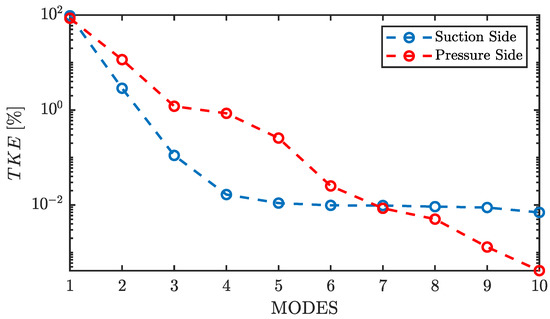 Figure 7 shows the percentage of explained by the first 10 modes, in red for the pressure side and blue for the suction side.