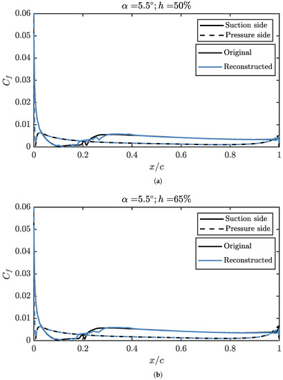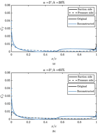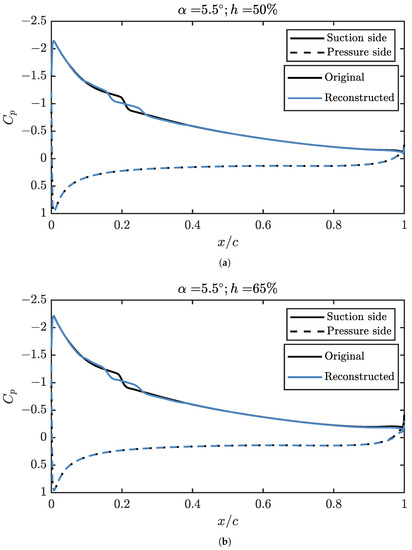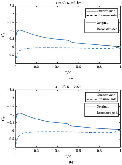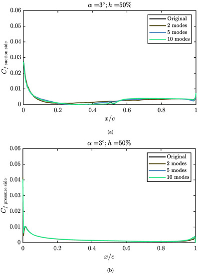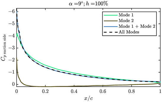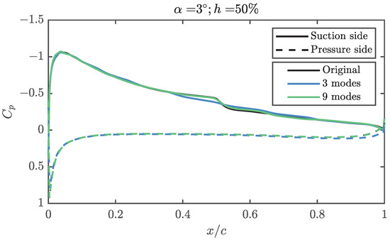 Although the first three modes of the suction side explain 99.5% of the , they are not enough to explain the transitional bubble over the airfoil, as can be seen in Figure 10. In this figure, the angle of attack is set to 3° and the relative height of the propeller to 50%. It can be seen that, while the suction peak, which concentrates the largest fraction of in the problem, is well defined, from 50% of the chord it is possible to find discrepancies. A greater number of modes are required if the aerodynamic behaviour is to be modelled more realistically. The first three modes are enough to reproduce a shape similar to that of a LSB, albeit with a lower intensity and a different position, moved towards the trailing edge. Regarding the trailing edge behaviour, it is relatively well reproduced in any case, even when only three modes are used to reconstruct the solution. As expected from the results of Figure 7, a reduced number of modes is enough to get most of the behaviour of the pressure coefficient distribution, so the lift coefficient, pitching moment and structural stresses over the skin can be computed with good accuracy from a limited amount of information. Only when detailed information is required, as it is for the position of the LSB, more than three modes are necessary.