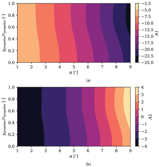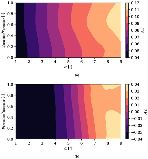 The first configuration coefficient, , varies slightly with the height of the propeller for a given angle of attack. From another point of view, for a given relative height, this coefficient is is much more variable with the variation of the angle of attack. The value of the coefficient has a negative value for any combination of height and angle of attack, so it influences the mode in all positions, finding the greatest influence at the maximum angle of attack and close to the highest position. At around 75% of relative propeller height, however, the trend is inverted and the value of starts to decrease: the propeller is too high and the effects of the boundary layer ingestion are reduced.