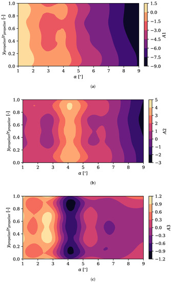 Configuration coefficients for the first three modes of the pressure coefficient over the pressure side of the airfoil, as a function of the angle of attack and the relative propeller position. (a) Configuration coefficient of the first mode of the pressure coefficient over the pressure side. (b) Configuration coefficient of the second mode of the pressure coefficient over the pressure side. (c) Configuration coefficient of the third mode of the pressure coefficient over the pressure side.