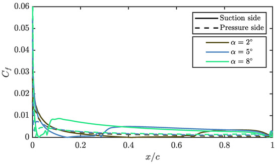 The friction coefficient is studied in the same way as . Representing the evolution of this coefficient for a given propeller position 50% on Figure 14, the advancement of the LSB can be observed, marked by the fast growth of followed by a null value of the coefficient, indicating where the bubble is located. In turn, the changes in the intrados are small, and the value of is practically constant throughout the chord.