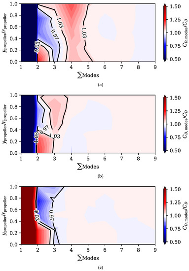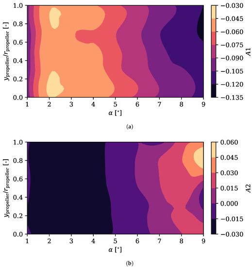 The second and third modes ( and ) have more complex structures and explain more than in the case of the suction side, although their effect over the global aerodynamic coefficients is somewhat limited as the absolute value of the over the pressure side is smaller. It is interesting to note the peak in value around an angle of attack of 4°. At that position, they maximise the value of at the leading stagnation point, widening it. At angles of attack smaller or bigger, the bigger value of the configuration coefficient of the third mode makes the stagnation zone narrower. Regarding the propeller position, at low positions the flow accelerates more over the intrados, reducing the pressure coefficient.