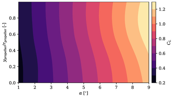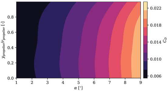The propeller, modelled with a BEMT actuator disc, uses geometrical data and airfoil drag polar results obtained from a panel method with interactive boundary layer corrections code, XFLR5 [37], which is based on Mark Drela’s XFOIL [38]. The rotational speed of the propeller was set so that the total thrust produced by all the propellers was equal to the total drag of the aircraft in each simulation, as shown in Equation (2).