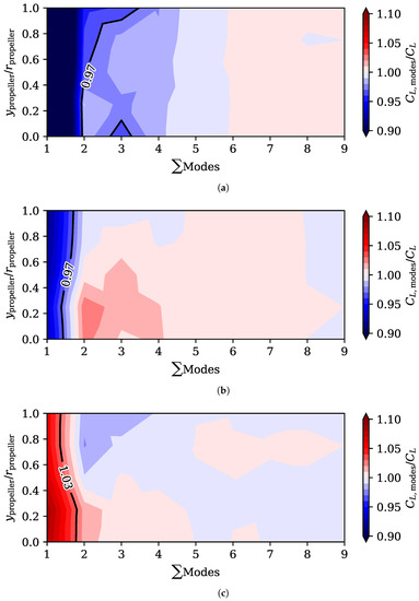 This position is represented in Figure 12, where it can be seen that the first mode practically explains all the by itself. Rising the propeller position can be used to produce higher lift: for a given angle of attack, the value of the due to the first mode can be increased 10% to 20% by rising the propeller to around 75% while maintaining the thrust equal to the drag.