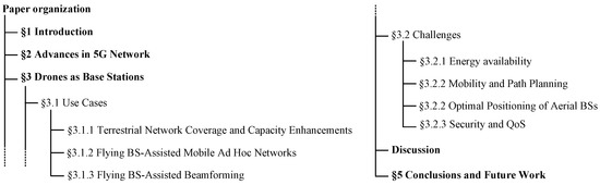 The layout of the rest of this paper is as follows: Section 2 follows this introduction, which documents the evolution of cellular communications and the potential offered by 5G/B5G/6G networks; Section 3 introduces the reader to the concept of using unmanned aerial vehicles to extend cellular connectivity and is divided into two main subsections: Section 3.1, which describes the various potential use cases of this technology and Section 3.2, which analyzes the main challenges currently faced. Section 4 discusses the overall developments enabling the acceleration of aerially supported next-generation cellular communications. Section 5 concludes this paper with comments regarding further work in this field and possible extensions of existing research. Figure 1 provides a high-level view of the paper’s structure, discussed topics and overall flow.