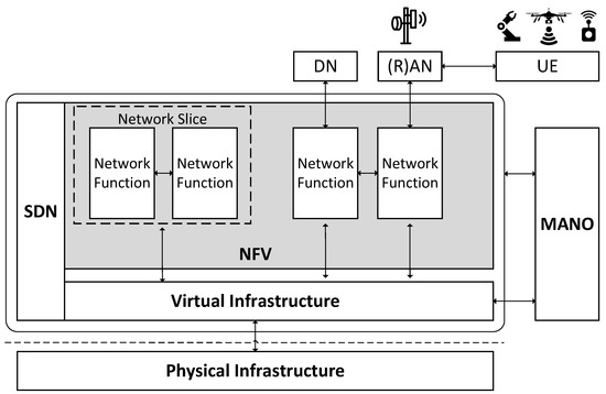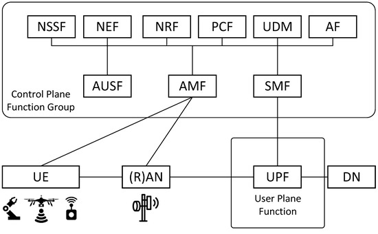 The core elements of the 3GPP 5G architecture are defined in ETSI TS 123 501 V15.2.0 (2018-06). As demonstrated in Figure 2, the core 5G services (implemented in the form of network functions (NFs)), are the network slice selection function (NSSF), the network exposure function (NEF), the network repository function (NRF), the policy control function (PCF), the unified data management (UDM), the application function (AF), the authentication server function (AUSF), the access and mobility management function (AMF), the session management function (SMF), the user plane function (UPF), the data network (DN), the radio access network (RAN), and the user equipment (UE).