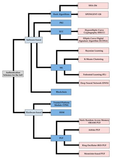 Software-based authentication schemes solely rely on software, mathematical algorithmic approaches, secret keys to authorize the nodes, and encryption methods (e.g., RSA and Advanced Encryption Standard (AES)). Additionally, the one-way hash functions have been traditionally used in modern cryptography and information-security applications, such as Message Authentication Codes (MACs) and digital signatures, in order to quickly map message data of arbitrary sizes to bit arrays of fixed, compressed sizes [30]. Several cryptographic hash algorithms have been proposed over the last 30 years. Among them, some older algorithms (e.g., the Message Digest 5 (MD5), Secure Hash Algorithm-1 (SHA-1), RACE Integrity Primitives Evaluation Message Digest (RIPEMD), and Whirlpool) are vulnerable to collision attacks and length extension attacks. However, more recent implementations (e.g., truncated SHA-2, SHA-3, BLAKE2, and BLAKE3) can resist these types of attacks. In addition, the widely adopted public key cryptography schemes that are based on the Public Key Infrastructure (PKI) framework allow for the secure exchange of data using digital certificates that bind an entity to its public key [31]. Using PKI, the legitimacy of the IoD network entities can be verified, and information can be securely exchanged. Moreover, Elliptic-Curve Cryptography (ECC) has been used to offer an equivalent security level to RSA with abundant smaller key sizes [32]. ECC belongs to the family of asymmetric public-key cryptosystems and is related with the mathematics of elliptic curves and with the difficulty of the Elliptic Curve Discrete Logarithm Problem (ECDLP). Among the advantages of ECC are the rapid generation of the keys and the digital signature, as well as the minimal required computing resources. Additionally, ECC eliminates the need for mathematical co-processors. However, ECC can be potentially susceptible to side-channel attacks and twist-security attacks that intend to leak information and invalidate security for the private keys. Identity (ID)-based security has been also used for the authentication process and is associated with an account login using a username and password, fingerprint biometric authentication, and facial recognition.