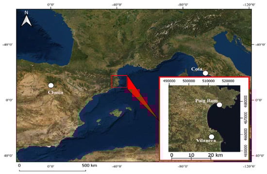 - Agustí, B.; Codina, D.; Dehesa, R.; Llinàs, J.; Merino, J.; Montalbán, C.; Vargas, A. Excavacions arqueològiques a Vilanera (L’Escala, Alt Empordà). Trib. D’arqueologia 2001, 2000, 99–114. [Google Scholar]